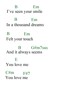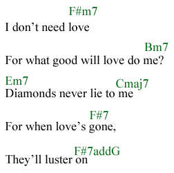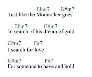 The uniqueness of the verse’s chord progression suddenly appears when the verse ends by moving from B major to F#m7—yes, a minor fifth. Typically, in a pop song, that would be a major fifth. But maestro Barry is a wizard of chord progressions—in his hands, unlikely chord sequences somehow fit together pleasantly. This leads to the chorus, or at least to the first stanza of the chorus—a minor seventh chord progression, rather than a dominant major chord. It’s something that Barry introduced in “Diamonds Are Forever”: an F#m7, moving to a Bm7. Listening to the CD, I hear the chorus structured in this way: